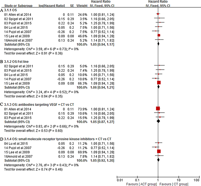 Figure 5: A. Overall survival (OS) of the studies; B. Subgroup analysis of the effect of angiogenesis inhibitors on OS in first-line settings; C. Subgroup analysis of OS for antibodies targeting VEGF plus CT versus CT; D. Subgroup analysis of OS for small molecule angiogenesis inhibitors plus CT versus CT.