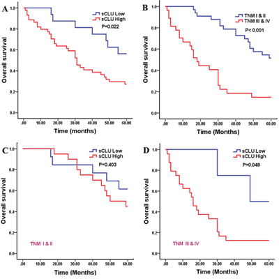 Figure 2: Kaplan-Meier analysis for overall survival of 60 HCC patients. The survival curves were calculated according to the sCLU expression or TNM stages of HCC. Two-sided log-rank tests were performed to evaluate the statistical significance. A. the 5-year overall survival curve made according to high or low sCLU expression (P=0.022); B. the survival curve made according to high or low TNM stages (P<0.001); C. the 5-year overall survival curve made according to sCLU expression in HCC patients at I ~ II stages (P=0.403); D. the 5-year overall survival curve made according to sCLU expression in HCC at III ~ IV stages (P=0.048). The red line is the higher sCLU group; and the blue line is the lower or negative sCLU group. HCC, hepatocellular carcinoma; sCLU, secretory clusterin; TNM, tumor-node-metastasis.