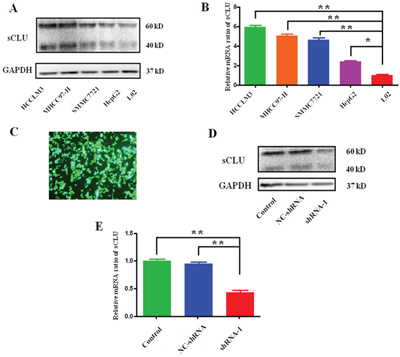 Figure 3: Expression of sCLU in HCC cells or silencing by specific shRNA. Expression of sCLU in HCCLM3, MHCC97-H, SMMC7721, HepG2, and L02 cells was detected by Western blotting at protein level or qRT-PCR at mRNA level. Then, the HCCLM3 cells were transfected with the specific shRNA to abrogate sCLU expression. A. sCLU expression among the HCC cells analyzed by the Western blotting with GAPDH as the internal control; B. sCLU mRNA expression among the HCC cells analyzed by the qRT-PCR; C. the fluorescence photomicrographs after the HCCLM3 cells transfected with specific shRNA-1; D. the comparative analysis of sCLU expression in the group with or without shRNA-1 transfection detected by the Western blotting; E. the comparative analysis of sCLU mRNA expression in the group with or without shRNA-1 transfection detected by qRT-PCR. The data were presented as means ± SD (n=3). *, P<0.05; **, P<0.01.