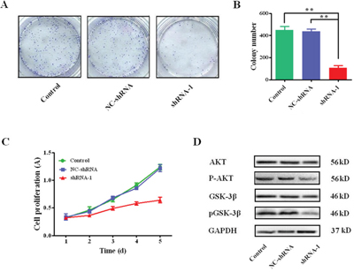 Figure 4: Silencing sCLU on effects of colony formation and cell proliferation. A. the colony formation assay of HCC cells, and the representative micrographs from the Giemsa-stained colonies formed by HCCLM3 cells with transfection of shRNA-1, NC-shRNA or without transfection; B. the comparative analysis of the micrograph quantification results from the Giemsa-stained HCCLM3 cells transfected with shRNA-1, NC-shRNA or control group (n=3); C. the viability of HCCLM3 cells transfected with the shRNA-1, NC-shRNA or without transfection determined by CCK-8 assay on days 1 to 5; D. the levels of AKT, phosphorylated-AKT, GSK-3β, and phosphorylated-GSK-3β expressions detected by Western blotting. The data were presented as means ± SD (n=3). **, P< 0.01.