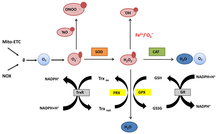 Figure 1: Generation and scavenging of reactive oxygen species (ROS). Electrons released from the mitochondrial electron transport chain (Mito-ETC) and produced by NADPH oxidases (NOX) are the major source of endogenous reactive oxygen species. Coupled to molecular oxygen they give rise to the primary free radical and the precursor of remaining species - superoxide (·O2-). In the reaction with a short-lived nitric oxide (·NO), superoxide forms a highly reactive peroxynitrate (ONOO-) able to modify structure and function of proteins. Alternatively, superoxide dismutase (SOD) converts superoxide to hydrogen peroxide (H2O2), which can be further transformed in several ways. In the presence of transition metal ions like Fe2+ (Fenton’s reaction) or in reaction with superoxide, H2O2 forms highly reactive hydroxyl radical (·OH) which damages lipids, proteins and DNA. Peroxysomal enzyme catalase (CAT) neutralizes H2O2 to water and oxygen. H2O2 might be also utilized in the reaction of oxidation of monomeric glutathione (GSH) to the glutathione disulfide (GSSG) or reduced thioredoxin (Trxred) to the oxidized thioredoxin (Trxox) catalyzed by glutathione peroxidase (GPX) or peroxidases involved in the thioredoxin turnover (PRX). Reduced glutathione pool is restored by glutathione reductase (GR) which reduces oxidized glutathione with the use of NADPH. Similarly, thioredoxin reductase (TrxR) balances the amount of reduced Trx by transferring electrons from NADPH to oxidized catalytic sites. Thanks to the thiol groups in the Cys residues both glutathione and thioredoxin participate in the reduction of oxidized proteins. Their synthesis as well as the turnover are under tight homeostatic control creating a system responsible for reduction of redox-sensitive proteins upon oxidative stress.