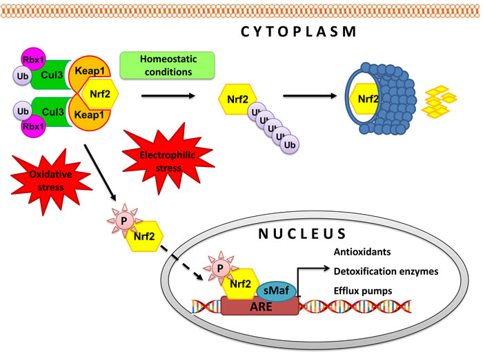 Figure 2: Regulation of Keap1-Nrf2 pathway. Under basal conditions, cytosolic repressor Kelch-like ECH-associated protein 1 (Keap1), a substrate adaptor protein for Cullin 3 (Cul3)/Rbx1 ubiquitin ligase, holds Nrf2 in the cytoplasm and promotes its ubiquitination followed by 26S proteasomal degradation [58,59]. In the presence of electrophilic and/or oxidative stimulus, Nrf2 is released from Keap1 and translocates to the nucleus where it recruits small Maf protein (sMaf) and binds with response element (ARE) in the promoter regions of its target genes, inducing their expression. Activation of Nrf2 pathway allows for cell adaptation and survival by regulating expression of antioxidans, anti-inflammatory and phase II detoxification enzymes such as superoxide dismutase (SOD), gluthatione S-transferase (GST), heme oxygenase-1 (HO-1), NAD(P)H-quinone oxidoreductase (NQO1), UDP-glucuronosyl transferases (UGT), γ-glutamylcysteine synthetase (γGCS) and efflux pumps like multidrug resistance-associated protein 2 (MRP2) and breast cancer resistance protein (BCRP). Proteins transcriptionally controlled by Nrf2 take part in biosynthesis, utilization and regeneration of glutathione, thioredoxin, and NADPH resulting in restoration of cellular redox homeostasis.