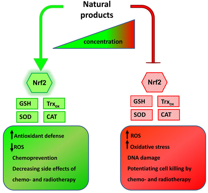 Figure 3: Natural products action on cellular antioxidants is concentration-dependent. Many natural compounds display opposing properties in cancer cells, depending on their concentration. At lower concentrations they often boost cells’ antioxidant capacity by activating Nrf2-dependent signaling and enhancing expression of ROS scavengers, lowering ROS burden. These properties allow for using natural compounds in chemoprevention and as agents decreasing side effects of standard anticancer regimens. On the other hand, same compounds used at higher concentrations inhibit antioxidant defense and induce oxidative stress. By doing that they enhance the effectiveness of chemo- and radiotherapy and allow for lowering their doses.