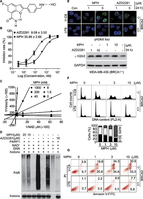 Figure 1: MPH inhibits PARP1. (A) chemical structure of MPH. (B) the concentration-effect relationships of PARP1 inhibition by MPH and the positive control AZD2281 assayed by ELISA. Insets: IC50 values. (C) the Lineweaver-Burk plots based on the reaction velocity at different concentrations of NAD+ and MPH measured by ELISA. (D) MPH or AZD2281 inhibited PARP1-catalyzed PAR formation in a cell-free system determined by Western blotting. (E) the changes in the formation of γH2AX foci in V-C8 and V79 cells (upper panel; confocal microscopy) and in the protein levels of γH2AX in MDA-MB-436 cells (lower panel; Western blotting) induced by MPH or AZD2281. (F) and (G), MPH selectively induced cell cycle arrest (F) and apoptosis (G) in HR-deficient cells. BRCA2-deficient (V-C8) and proficient (V79) cells were respectively exposed to MPH for 24 h (F) or 48 h (G) and then collected for PI-stained (F) or Annexin V-FITC-PI-stained (G) flow cytometry. All data were expressed as mean ± SD or representative images from 3 independent experiments.