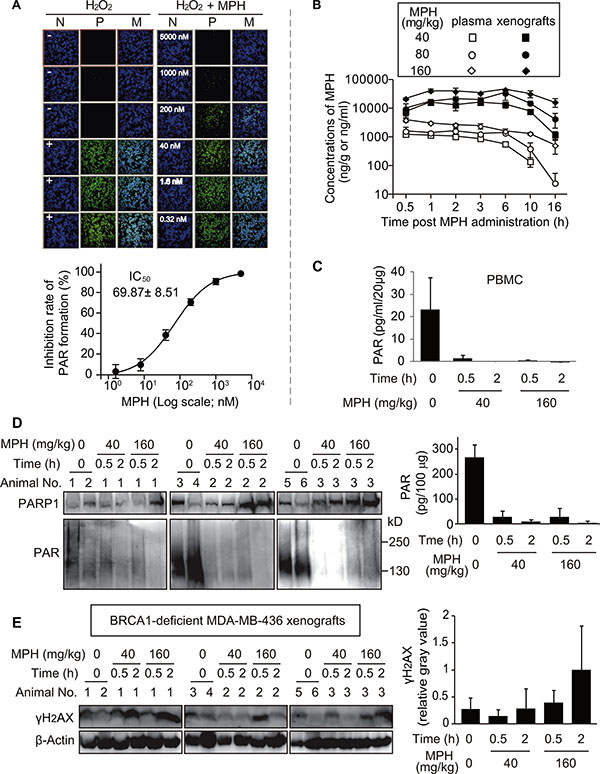 Figure 4: Pharmacodynamic biomarker analyses reflecting the in vitro and in vivo activities of MPH. (A) MPH prevented the H2O2-triggered formation of PAR in BRCA2-deficient Capan-1 cells. Upper: representative images of PAR formation. Nuclei stained with DAPI indicated the cell density; the FITC images revealed the levels of cellular PAR. N, nuclei; P, PAR; M, merged. Lower: The concentration-response curve quantitatively showed the inhibition of PAR formation by MPH. The data were expressed as mean ± SD, obtained from the upper images and from three independent experiments. (B) the time-concentration curve of MPH in plasma and xenografts following a single-dose oral administration to the nude micebearing BRCA1-deficient MDA-MB-436 subcutaneous xenografts (The same models were also used in (C–E). C, the levels of PAR formation in peripheral-blood mononuclear cells (PBMC) assayed by ELISA. Data were presented as mean ± SEM showing a representative data from two independent experiments, and three animals in each group. D and E, the levels of PAR (D) and γH2AX (E) in MDA-MB-436 cells of the xenografts determined by Western blotting. Left, representative images; right, semi-quantitative results (mean ± SD) from the corresponding images. Six animals in vehicle group, three animals in each MPH treated group.