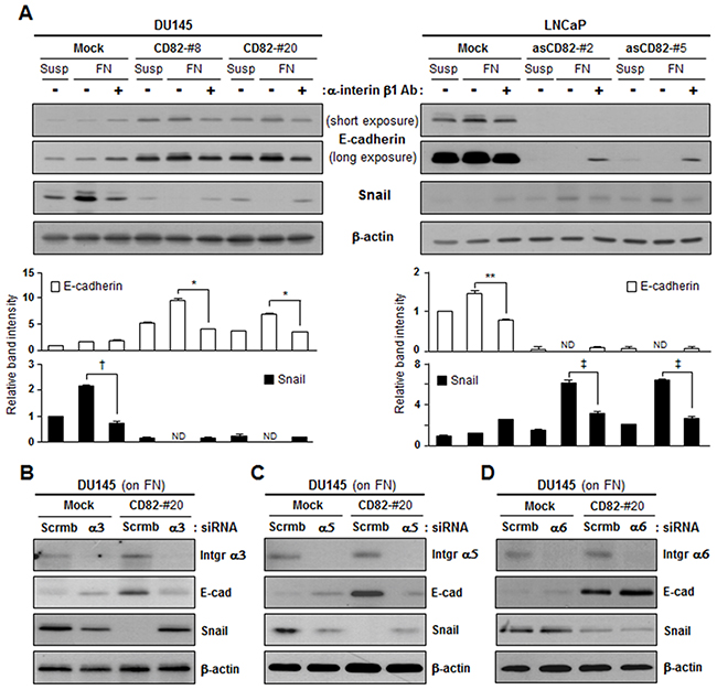 Figure 3: CD82 inhibition of fibronectin-induced EMT is dependent on α3β1 and α5β1 integrins. A. Stably CD82-transfected DU145 and antisense CD82 fragment-transfected LNCaP cell clones suspended in culture medium were pretreated with a mouse normal IgG1 or integrin β1-blocking IgG1 for 2 hours and cultured on plates precoated with fibronectin (FN) for 8 hours. Cells in suspension (Susp), and cells grown onto the plates were examined for expression of E-cadherin and Snail using immunoblotting analysis. Bar graphs under the immunoblots indicate the relative band intensity of E-cadherin and Snail normalized to the loading control (actin). Values are the mean ± s.d. from three separate experiments performed in triplicate (*, **, †, and ‡, p < 0.03). ND, not detectable. B-D. Cells grown on FN were transfected with either scrambled (scrmb) siRNAs or integrin α3 (B), α5 (C), or α6 (D) subunit-specific siRNAs and then examined for E-cadherin and Snail expression.