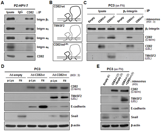 Figure 4: Intramembrane interactions of CD82 with β1 integrins are essential for CD82 inhibition of fibronectin-induced EMT. A. PZ-HPV-7 prostate epithelial cells were lysed with Brij 97 detergent, and immunoprecipitation (IP) was performed with normal mouse IgG or anti-CD82 antibody. The immunoprecipitates were analyzed by immnublotting using anti-integrin β1, α3, α5, or α6 antibody. B. CD82 mutant cDNA, which encodes CD82 with a large extracellular loop (LEL) substituted with that of TM4SF2 as illustrated, was generated by PCR and subcloned into the pAdEasy-1 adenoviral vector to produce recombinant adenovirus. C. CD82-deficient PC3 prostate cancer cells grown on fibronectin (FN) were infected with adenovirus containing a wild-type (wt) or mutant (mt) CD82 expression construct, and Brij 97 detergent lysates were subjected to immunoprecipitation with an anti-β1 integrin antibody followed by immunoblotting analysis using antibodies that recognize the C-terminus or LEL of CD82 and the LEL of TM4SF2. D. PC3 cells grown on poly-L(+)-lysine (p-Lys) or FN were infected with adenovirus containing a wt- or mt-CD82 expression construct and then assessed for the protein levels of E-cadherin and Snail. E. PC3 cells grown on FN were infected with wt-CD82 construct-containing adenovirus either alone or together with mt-CD82 construct-containing adenovirus and examined for E-cadherin and Snail expression. Numbers in parentheses represent the MOI values of adenovirus.