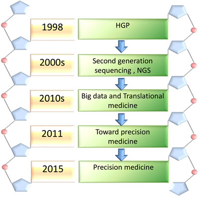With the completion of HGP and the rise of second-generation sequencing technology and next-generation sequencing technology (NGS) [16], bioinformatics analysis of large sets of data has been dramatically amplified in the 2000s. How should the big data be appropriately used for clinical applications? Translational medicine has partially solved this problem, but it is not sufficient [17, 18]. To address this question, the National Academy of Sciences made a systematic discussion of a new concept “Precision Medicine” in “Toward Precision Medicine: Building a Knowledge Network for Biomedical Research and a New Taxonomy of Disease” [19].