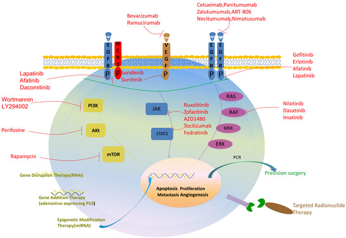 Figure 2: Precision medicine used for the treatment of HNSCC. This figure shows 5 major methods of precision medicine used in HNSCC patient: (1) inhibitors targeting cell surface signaling receptors, including EGFR, VEGFR, HER2 (2) inhibitors targeting cellular signaling pathways, including PI3K/Akt/mTOR, RAS/RAF/MEK/ERK, JAK/STAT3 (3) precision genetic manipulation therapies, including gene disruption therapy, gene addition therapy and epigenetic modification therapy (4) precision medicine combining with surgery (5) precision targeted radionuclide therapy.