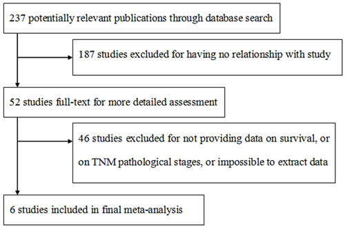The initial search strategy retrieved identified 237 articles, of which 185 articles were excluded as not being relevant. The remaining studies were assessed for eligibility, finally 6 studies met [31, 33-37] our entry criteria and were retrieved for more detailed evaluation (Figure 1). Their characteristics are summarized in Table 1. Among the 824 patients, 347 patients showed high level expression. Of six included studies, two provided data on 5-year overall survival while the other provided data on 2-year overall survival. The studies were conducted in four countries (Japan, South Korea, USA and Poland).