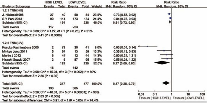 Among the six studies, there was two groups for TNM ( I-III ),of which the risk of 2-year overall survival in the high level group was distinct from that in the low level group (RR = 0.81, 95% CI 0.72–0.92, P = 0.0006; Figure 2). The other four groups were included in the same group for more information of TNM (Ⅰ-Ⅳ) stages, of which the risk of 2-year overall survival in the high level group was lower that in the low level group (RR = 0.27, 95% CI 0.09–0.80, P = 0.005; Figure 2).
