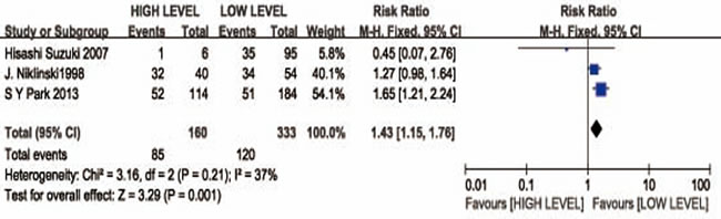 Review Manager 5.2(RevMan 5.2®, Nordic Cochrane Center and Copenhagen , Denmark) was used to perform analysis. We analyzed dichotomous variables using estimation of Risk ratios (RR) with 95%CI. The pooled effect was calculated using either a fixed-effects or a random-effects model. The I2 statistic was used to quantify the statistical heterogeneity of the studies. When the I2 value was >50%, indicating the presence of variability among the studies, a random-effects models rather than fixed-effects models was used to perform the meta-analysis. Risk ratios (RRs) with a 95% confidence interval (CI) were used to report the differences in clinical outcomes between the high level expression and low level expression of population. Forest plots were used to present the results of this meta-analysis. A P-value <0.05 was considered to be significantly different.