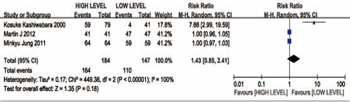 Pooled risk ratios (RRs) showed that CYFRA 21-1 high level in NSCSLC patients was associated with biologically higher TNM pathological stage(Ⅱ + Ⅲ + Ⅳ) (RR= 1,43; 95%CI: 1.15-1.76) (Figure 3). There were three groups including for analyzing relationship of CYFRA 21-1 expression level with the advanced TNM pathological stage(ⅢB + Ⅳ). As far as the advanced pathological stage of non-small cell lung cancer patients is concerned, the pooled RR estimates indicated that there was no statistical significance of CYFRA 21-1 level expression between high level expression and low level expression (RR =1.43, 95% CI: 0.85-2.41) (Figure 4).