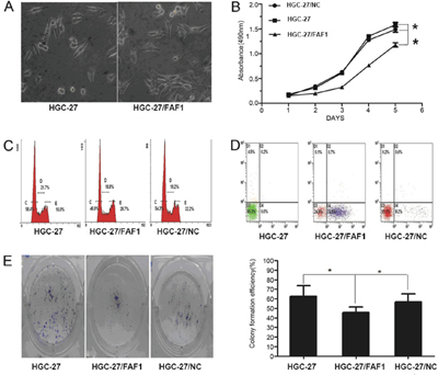 Figure 2: FAF1 overexpression inhibits gastric cancer cell proliferation and induces apoptosis in vitro. A. Morphological changes in HGC-27 cells as a result of FAF1 overexpression. B. Comparison of in vitro proliferation of HGC-27, HGC-27/FAF1 and HGC-27/NC cells. C. Comparison of cell cycle distribution of HGC-27, HGC-27/FAF1 and HGC-27/NC cultures, based on flow cytometry. D. Comparison of apoptosis levels in HGC-27, HGC-27/FAF1 and HGC-27/NC cells, based on flow cytometry. E. Comparison of colony formation by HGC-27, HGC-27/FAF1 and HGC-27/NC cells. The left panel shows representative results for the three types of cells. Quantitation of colony numbers is shown in the right panel. Data are mean ± SD of three independent experiments (n = 3). *P < 0.05, **P < 0.01.