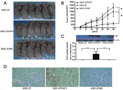 Figure 3: FAF1 overexpression inhibits tumor growth in vivo. A. Tumor volume was significantly smaller in nude mice injected with HGC-27/FAF1 cells than in mice injected with HGC-27 or HGC-27/NC cells. B. Growth of HGC-27/FAF1 tumors in nude mice was significantly slower than growth of HGC-27 or HGC-27/NC tumors. C. FAF1 expression in tumor xenografts, based on Western blotting. D. FAF1 expression in tumor xenografts, based on immunohistochemistry. Six animals were analyzed for each treatment condition. *P < 0.05, **P < 0.01.