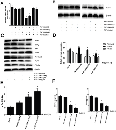 Figure 5: H. pylori down-regulates FAF1 expression via the NF-κB signaling pathway. A. Quantitative RT-PCR analysis of FAF1 mRNA levels in HGC-27/FAF1 cells not transfected or transfected with negative-control RNAi (RNAi-NC) or with RNAi targeting IKKβor p65. Cells were infected or not with H. pylori. *P < 0.05 vs untransfected cells or cells transfected with RNAi-NC. B. Western blotting of total lysates from HGC-27/FAF1 cells not transfected or transfected with negative-control RNAi (RNAi-NC) or with RNAi targeting IKKβ or p65. Cells were infected or not with H. pylori. C. Western blotting of proteins in the NF-κB signaling pathway. D. Western blotting showed that levels of phosphorylated IKKα/β, p65 and IκBα were lower in RNAi targeting IKKβ or p65 than in untransfected cells or cells transfected with negative-control RNAi (P < 0.05). E. The ratio of IκBα to P-IκBα was higher in cells transfected with RNAi against IKKβ or p65 than in untransfected cells or cells transfected with negative-control RNAi (*P < 0.05). F. Secretion of TNF-α and IL-8 was lower in H. pylori-infected cells transfected with RNAi against IKKβ or p65 than in H. pylori-infected cells that were untransfected or transfected with negative-control RNAi (*P < 0.05). Data are the mean ± SD of three independent experiments.
