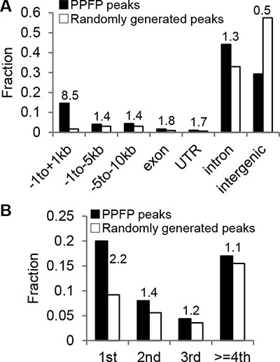 Figure 1: Annotation of PPFP peaks relative to genic and intergenic regions. (A) Peaks with more than one annotation were assigned to one region only with prioritization going from left to right. (B) The intron group of A is divided into individual introns. The numbers above the bars indicate the ratios of PPFP to randomly generated peaks.