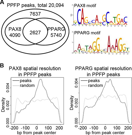 Figure 2: PPFP peaks contain PAX8 and/or PPARG motifs. (A) Venn diagram showing the overlap of PAX8 and PPARG motifs within PPFP peaks, and the logos for PAX8 and PPARG motifs. (B) Spatial resolution analysis of PAX8 and PPARG motifs within PPFP peaks (black lines). The grey lines show the distribution of each motif in randomly generated 400 bp regions across the genome, as negative controls.