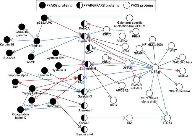 We performed an analysis of protein interaction networks for individual genes targeted by PPFP with only PPARG motifs, or with only PAX8 motifs (see Materials and Methods for details). The largest, directly-connected subnetworks overlap and are presented in Figure 3. The network of genes with PPARG motifs has a major node at the transcriptional coactivator NCOA2 and includes proteins involved in the cell cycle (Cyclin D), extracellular matrix (E-cadherin), response to cell stress (GADD45G), cell adhesion (Galectin-3), fatty acid metabolism (ELOVL6), and other processes. The largest subnetwork of genes with PAX8 motifs has a major node at NF-κB and overlaps with the PPARG network at multiple proteins including the previously-mentioned Cyclin D and Galectin-3. Similar to the PPARG network, the PAX8 network includes proteins involved in the extracellular matrix (integrin beta 4), response to cell stress (GADD45 beta), and other processes.