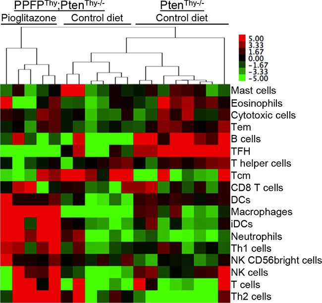 Figure 4: Heat map of overall gene expression scores for types of immune cells in thyroid glands of PPFPThy;PtenThy-/- mice fed pioglitazone or control diet, or PtenThy-/- mice fed control diet. A heat map of expression of the individual genes used to determine the overall scores is found in Figure S3. Gene expression was measured by RNA-seq. The samples and cell types were clustered by hierarchical clustering using average linkage and the correlation distance measure. Abbreviations: Tem, T effector memory; TFH, T follicular helper; Tcm, T central memory; DCs, dendritic cells; iDCs, immature DCs; Th1, T helper 1; NK, natural killer; Th2, T helper 2.