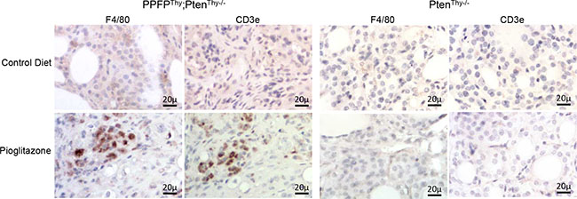Figure 5: Immunohistochemical staining for F4/80 and CD3e in thyroid glands from PPFPThy;PtenThy-/- and PtenThy-/- mice fed pioglitazone or control diet.