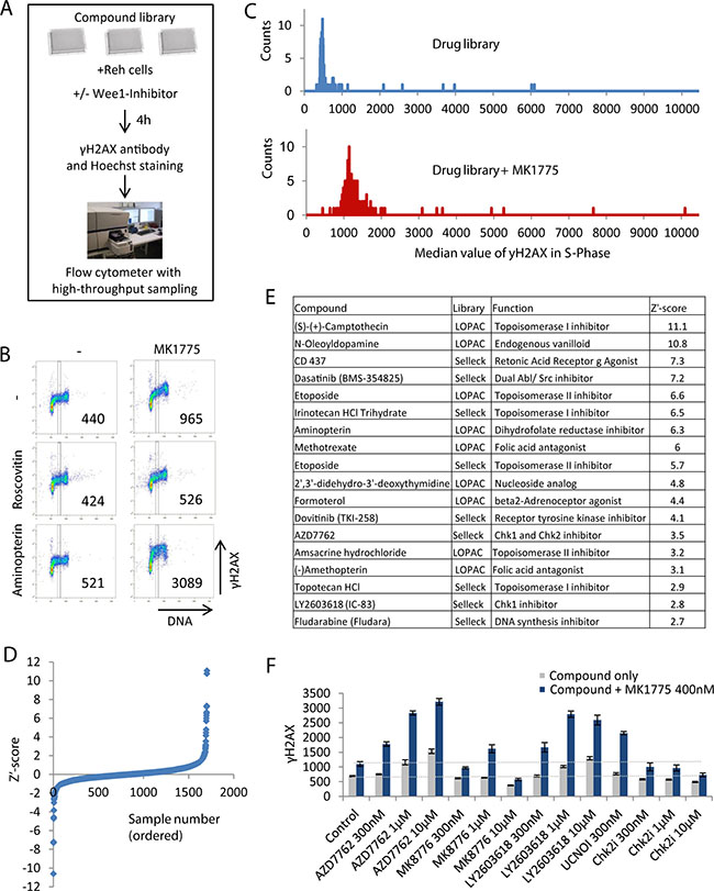 To uncover molecular mechanisms behind replication catastrophe and to identify promising drug combinations for cancer treatment, we designed a flow cytometry-based screen combining different compounds with the Wee1 inhibitor MK1775 (Figure 1A). Reh leukemia cells were incubated with the Lopac 1280 or Selleck Cambridge Cancer 384 compound libraries for 4 hours with or without MK1775. DNA damage and cell-cycle profiles were assessed by flow cytometry using an antibody to the DNA damage marker γH2AX and the DNA-stain Hoechst, respectively. Reh cells were used because they grow in suspension at high density, enabling flow cytometry analysis of samples from single wells of 384-well plates without trypsinization. Furthermore, these cells show relatively normal DNA-damage checkpoint responses [25]. To achieve a wide window for detection of compounds that enhance MK1775-induced S-phase DNA damage, a concentration of MK1775 (400 nM) that gave only a small increase in γH2AX staining by itself was chosen (Figure 1B, top panel).