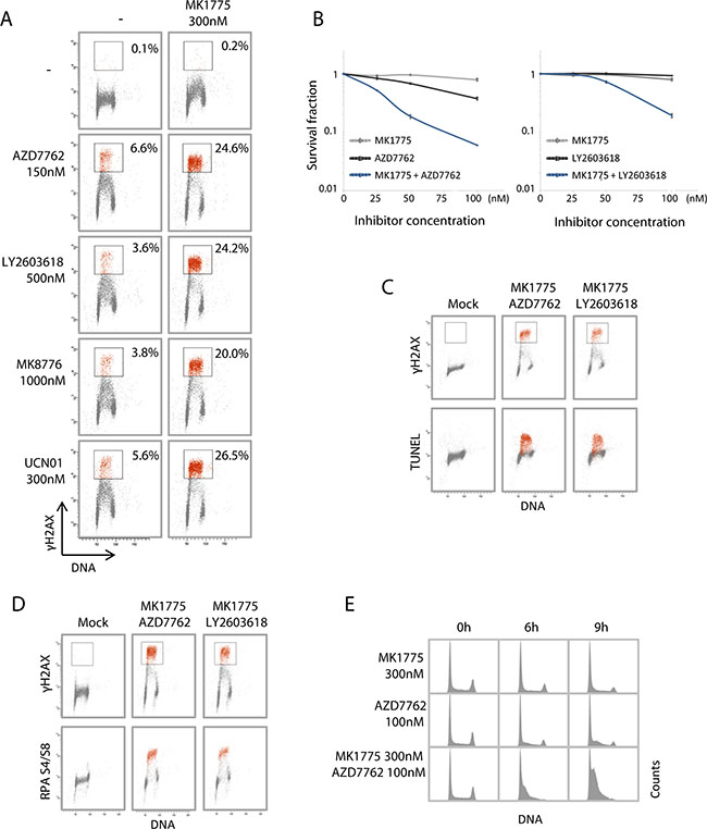 Figure 2: Combined Wee1 and Chk1 inhibition synergistically enhances replication catastrophe. (A) Flow cytometric analysis of U2OS cells treated for 3 hours with the Wee1 inhibitor MK1775, either of the Chk1 inhibitors AZD7762, LY2603618, MK8776, UCN01, or the combination of MK1775 with each of the Chk1 inhibitors. Scatter plots of γH2AX versus Hoechst (DNA) are shown from a representative experiment. Numbers are the percentage of cells within the indicated region with strong γH2AX signal (red color). (B) Clonogenic survival of U2OS cells treated with MK1775 and/or AZD7762 (left) or MK1775 and/or LY2603618 (right), at concentrations 0, 25, 50 or 100 nM for 24 hours. Average survival fractions from three independent experiments are shown. Error bars: SEM (n = 3). (C) U2OS cells treated with a combination of MK1775 (300 nM) and AZD7762 (150 nM) or LY2603618 (500 nM) for 3 hours were processed for simultaneous flow cytometric analysis of γH2AX and the TUNEL assay. Scatter plots of γH2AX versus Hoechst (DNA) (top panel) and TUNEL versus Hoechst (bottom panel) are shown. A region defined based on cells with strong γH2AX signals is shown in red color. (D) U2OS cells treated as in C processed for simultaneous flow cytometric analysis of γH2AX and phospho-RPA (Ser4/Ser8). A region defined based on cells with strong γH2AX signals is shown in red color. (E) U2OS cells treated with MK1775 or AZD7762 or the combination of the two inhibitors as indicated, were stained with Hoechst and analyzed by flow cytometry. DNA histograms are shown.