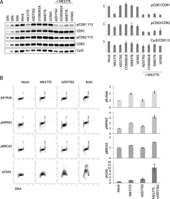 Figure 3: S-phase CDK activity poorly correlates with the extent of DNA damage after Chk1/Wee1 inhibition. (A) Left: Immunoblot analysis on parallel samples within the same experiment as in Figure 2A collected at one hour after treatment. U2OS cells were exposed to MK1775 (300 nM) and/or AZD7762 (150 nM), LY2603618 (500 nM), MK8776 (1000 nM) and UCN01 (300 nM) for 1 hour. 10%, 20% and 50% of the non-treated sample (Mock) were loaded in the three first lanes to measure the dynamics for each antibody, respectively. Right: Quantifications of phospho-CDK1 (Tyr15) (relative to CDK1), phospho-CDK2 (Tyr15) (relative to CDK2), and Cyclin E levels (relative to CDK1 or CDK2). Error bars: SEM (n = 2 or 3). (B) Flow cytometric analysis of CDK-dependent phosphorylations compared to γH2AX in S-phase cells. U2OS cells were treated with MK1775 (600 nM), AZD7762 (100 nM) or both MK1775 (600 nM) and AZD7762 (100 nM) for 1 hour, or left untreated (Mock). The four samples were bar-coded with Pacific Blue before antibody staining with the indicated antibodies. S-phase cells are indicated in dark color. Graphs show average median values in S-phase (relative to Mock) from three independent experiments. Error bars: SEM (n = 3).