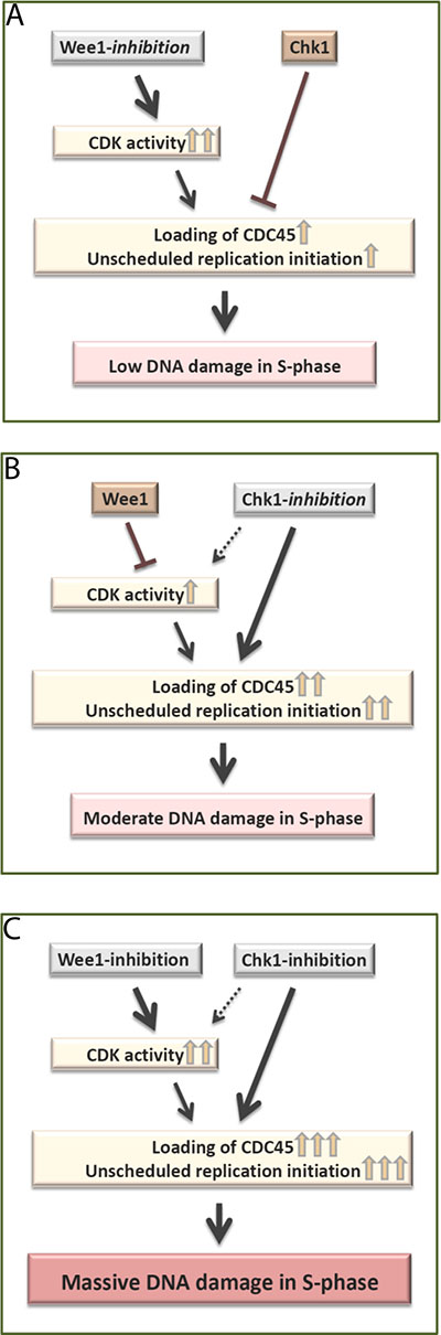Figure 5: Model. (A) Wee1-inhibition alone causes very high CDK activity in S-phase, but Chk1 mediated suppression of CDC45 loading limits replication initiation. This results in low levels of S-phase DNA damage. (B) Chk1-inhibition alone causes a moderate increase in CDC45 loading, which is limited due to Wee1 mediated suppression of CDK activity. This results in moderate levels of S-phase DNA damage. (C) Simultaneous Wee1- and Chk1- inhibition removes the restraints on both CDK activity and CDC45 loading. Consequently, there is a strong increase in CDC45 loading and subsequent massive DNA damage in S-phase.