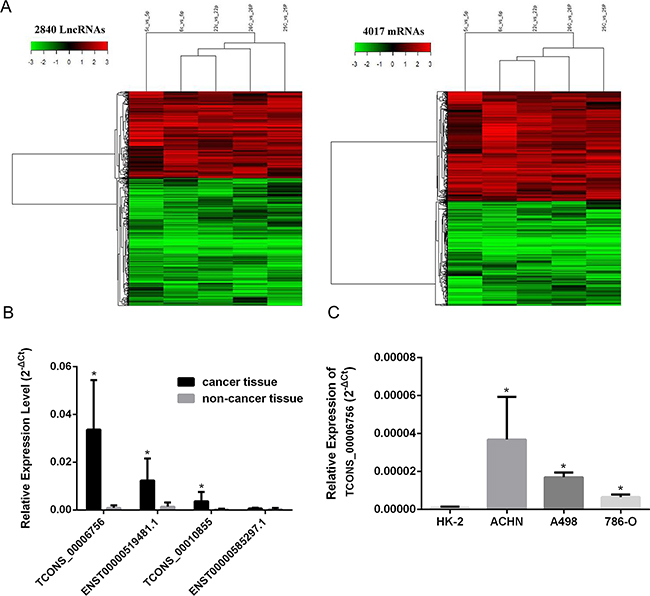 Figure 1: HEIRCC expression in RCC cell lines and tissues. A. Hierarchical clustering analysis of lncRNAs and mRNAs that were differentially expressed ( > 2-fold; P < 0.05) in 5 pairs of RCC and nontumor samples (c, cancer tissues; p, paired nontumor samples; 5-6-22-25-26, patient number). Red represents high expression and green represents low expression. B. The expression of four selected lncRNAs including HEIRCC in RCC patients. C. The relative expression of HEIRCC mRNA in renal cancer and normal cell line.*P < 0.05.