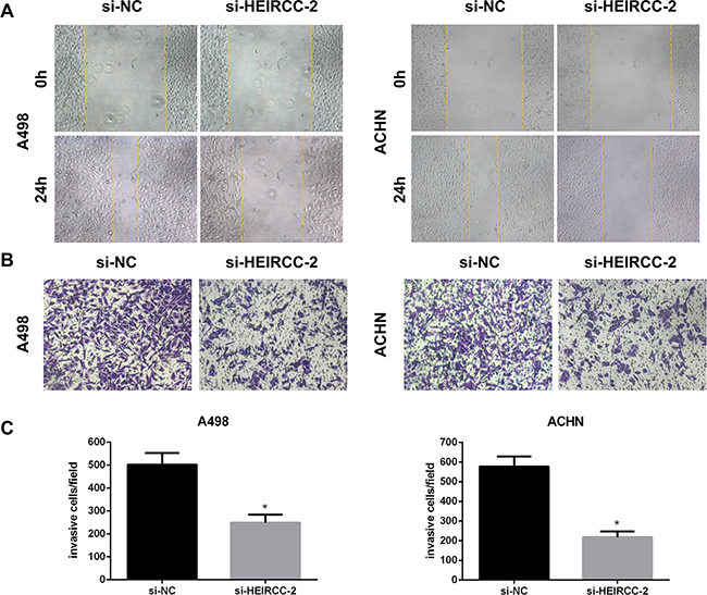 Figure 3: Effects of HEIRCC on RCC cell progression. A. The migration and B,C invasion capacity of A498 and ACHN cells was decreased by HEIRCC-siRNA.*P < 0.05.
