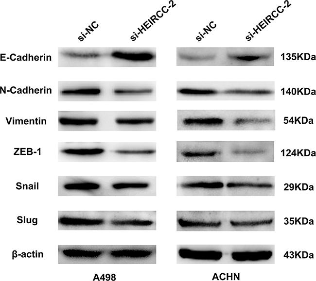Since EMT is crucial for tumor propagation and metastasis, the effects of HEIRCC on EMT were analyzed. Interestingly, depletion of HEIRCC resulted in upregulated E-cadherin as well as downregulated N-cadherin and Vimentin. In addition, EMT transcription factors were analyzed, and partial loss of endogenous HEIRCC expression overtly decreased ZEB1 amounts, whereas Snail and Slug amounts showed no remarkable changes. Overall, the above findings pointed to HEIRCC as a new positive regulator of EMT, with a function in RCC malignancy (Figure 4).