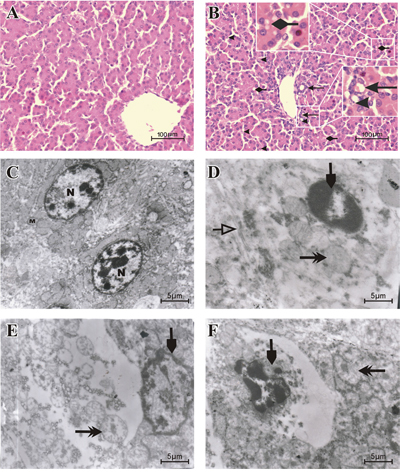 Microscopically, degenerative reversible lesions were seen, from mildest to severest degree with various distributions in AFB1 group. Compared to control group (Figure 1A), slight to moderate hydropic degeneration, fatty vacuolar degeneration and proliferation of bile duct in hepatocytes were seen in AFB1 group. Moreover pyknotic and fragmented nuclei were also visible in AFB1 group (Figure 1B). Results of ultrastructural observation revealed irregular, fragmented and condensed nucleus, swollen mitochondria with reduced number of cristae and swollen endoplasm reticulum in AFB1 group ( Figure 1D-1F) when compared to control (Figure 1C). AFB1 induced histopathological lesions were observed in chicken liver. The incidence of liver congestion, vacuolar or fatty degeneration, proliferation of bile duct and nuclear fragmentation were seen going up from day 7 to day 21 in AFB1 intoxicated chickens whereas no lesions were observed in the control group (Table 1).