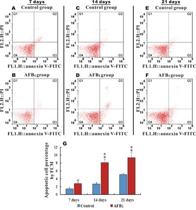 Figure 2: Apoptotic hepatocytes percentage and scattered analysis of early and late AFB1 induced apoptosis in chicken hepatocytes. Figure A, C, E and B, D, F. represents scattered analysis of early (Annexin-V positive and PI negative) and late (Annexin-V and PI positive) hepatocytes apoptosis in the control and AFB1 groups at 7, 14 and 21 days respectively, while G. is a bar graph showing apoptotic percentage rate in the control and AFB1 group at day 7, 14 and 21 by flow cytometer (number of chickens, n=6). *p<0.05, or **p<0.01, when compared to the control.