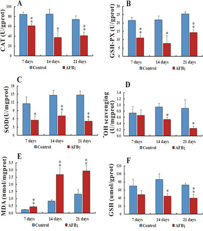 Compared to the control group, the activities of CAT (Catalase) and GSH-Px (Glutathione Peroxidase) in the AFB1 group were observed significantly downregulated (p<0.05 or p<0.01) throughout the experiment at different time points. Activity of SOD (Superoxide Dismutase) and Hydroxyl free radical scavenging were also seen remarkably down (p<0.05 or p<0.01) in the AFB1 group compared to the control at 14 and 21 days. The contents of MDA (Malondialdehyde) were observed significantly upregulated at 7, 14 and 21 days (p<0.01), while GSH (glutathione) contents were seen reduced (p<0.05 or p<0.01) at 14 and 21 days in AFB1 group when compared to the control group (Figure 3).