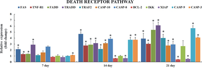 Induction of apoptosis can be triggered by the activation of death receptors including FAS, TNF-α, followed by DISC (death-inducing signaling complex) formation, which consists of CASPASE 8, and associated proteins such as FADD, TRADD and TRAF2 [17]. The present study revealed over expression of FAS and TNF-R1 receptors along with their associated genes i-e CASPASE 8, CASPASE 10, FADD, TRADD and TRAF2, which was consistent with earlier reports in human hepatocytes [38, 39] and with our recent study on thymocytes apoptosis [23]. IKK is crucial in activation of NF-kB based intracellular survival signaling and can activate the expression of several anti-apoptotic proteins [40, 41]. XIAP is apoptotic inhibitor that can plug up the process of cell death induced by any foreign stimuli [42]. In our present study mRNA levels of IKK were not seen significantly increased throughout the experiment at different time points and XIAP expression was significantly decreased at 14 and 21 days and the expression of FADD was much higher than TRAF2. Taken all together present study insinuated that TNF1-TRADD mediated signaling is originating from TRADD, supported by ability of FADD to activate apoptosis rather than activating NF-kB cell survival signaling.
