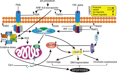 Tissue specific apoptosis caused by AFB1 induced toxicity has been studied in much detail, yet the mechanisms of death receptor induced apoptosis in hepatocytes remain least explored. In present study, we have delineated the mechanisms involved in death receptor provoked apoptosis using chicken liver as a model system. The results obtained in this study could be further used to understand involvement of death receptors in apoptosis and could help in amending the toxic effect provoked by AFB1.
