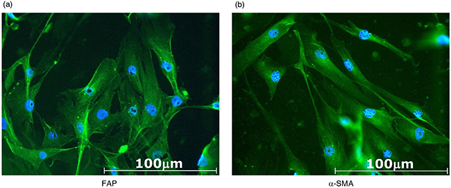 Established CAFs were seeded on chamber slides and cultured for 48 hours. Cells were then fixed in 4% paraformaldehyde and permeabilized in 0.2% Triton X-100 at room temperature (RT). Cells were incubated with 10% donkey serum in phosphate-buffered saline (PBS) containing 0.2% Trion X-100 at RT for 30 min to block the unspecific binding of antibodies. After the blocking solution had been washed out, cells were incubated with primary antibodies, FAP (1:100; Abcam, Cambridge, UK), or α-SMA (1 : 100; Abcam) at RT for 1 hour. After being incubated at RT for 1 hour with a secondary antibody (Donkey Anti-Rabbit immunoglobulin G (IgG) H&L FITC; 1:1000; Abcam), the slides were mounted with fluoroshield mounting medium containing DAPI (Abcam), and sealed with nail polish. Slides were stored at 4°C in a dark box and observed under a fluorescent microscope.