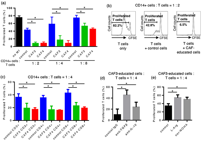 CAF-educated cells suppressed T cell proliferation through the production of TGF-β, IL-10, and arginase I