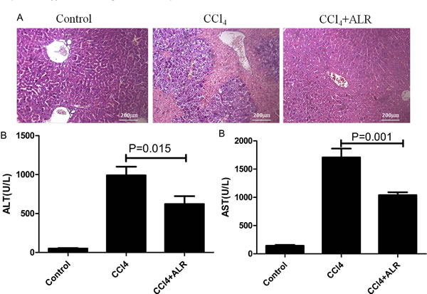 Figure 2: ALR protects mice against CCl4-induced acute liver injury. The ALR plasmid (10 mg/kg) or pcDNA3.0 (10 mg/kg) was injected into the tail vein 6 h before CCl4 exposure. The mice were sacrificed 48 h after the CCl4 injection, and control mice were injected with oil only. A. H&E staining of livers was performed in control mice, CCl4-treated mice and ALR/CCl4-treated mice.B. Serum AST and ALT levels were measured in control mice, CCl4-treated mice and ALR/CCl4-treated mice.