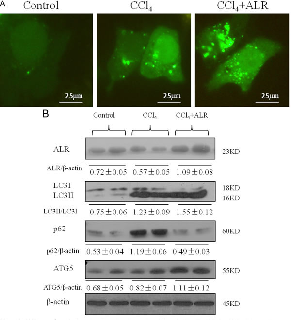 Figure 3: ALR promotes autophagy in CCl4-induced acute liver injury in vitro. The ALR plasmid (1 μg/ml) or pcDNA 3.0 (1 μg/ml) was transfected into AML12 cells. Cells were then cultured in RPMI-1640 for 6 h, followed by treatment with CCl4 (10 mmol/L) for 48 h. The control cells were treated with DMSO only. A. GFP-LC3B plasmids (1 μg/ml) were transfected into AML12 cells to observe the formation of autophagosomes. The green puncta indicated the presence of autophagosomes in control cells, CCl4-treated cells and ALR/CCl4-treated cells. B. The expression of LC3B, Atg5, p62 and ALR was measured by western blotting in control cells, CCl4-treated cells and ALR/CCl4-treated cells. A representative blot for two samples from each group is shown. Densitometry analysis of the proteins was performed for each sample.