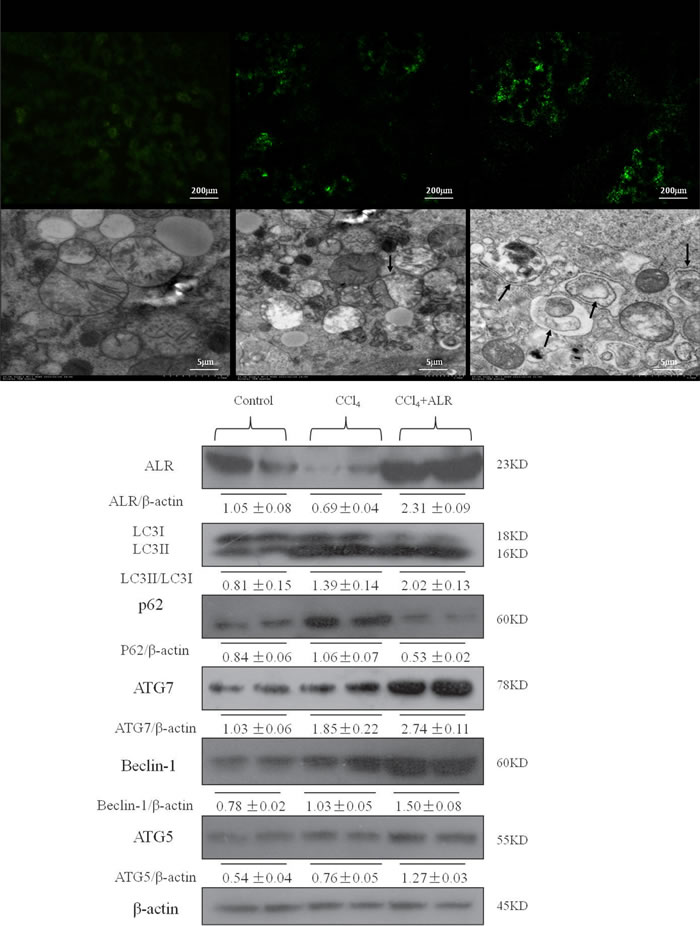 Figure 4: ALR promotes autophagy in mice with CCl4-induced acute liver injury. The ALR plasmid (10 mg/kg) or pcDNA 3.0 (10 mg/kg) was injected into the tail vein 6 h before CCl4 exposure. The mice were sacrificed 48 h after CCl4 injection, and control mice were injected with oil only. The sections from control mice, CCl4-treated mice and ALR/CCl4-treated mice were observed in an inverted fluorescence microscope and an electron microscope. The expression of LC3B, Atg5, Atg7, Beclin-1, p62 and ALR was measured by western blotting in control mice, CCl4-treated mice and ALR/CCl4-treated mice. A representative blot for two samples from each group is shown. Densitometry analysis of the proteins was performed for each sample.