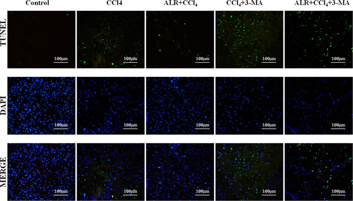 Figure 5: ALR suppresses apoptosis in mice with CCl4-induced acute liver injury through autophagic mechanisms. The ALR plasmid (10 mg/kg) or pcDNA 3.0 (10 mg/kg) was injected into the tail vein 6 h before CCl4 exposure. The suppression of autophagy was achieved with a tail vein injection of 3-methyladenine (3-MA, 1 mg/kg) 2 h before CCl4 exposure. The mice were sacrificed 48 h after CCl4 injection, and the control mice were injected with oil only. Apoptotic cells were stained in control mice, CCl4-treated mice, ALR/CCl4-treated mice, CCl4/3-MA-treated mice and ALR/CCl4/3-MA-treated mice with a TUNEL apoptosis detection kit (KeyGEN BioTECH, Nanjing, China). All of the images were obtained on an inverted fluorescence microscope.