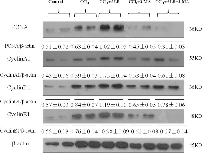 Figure 6: ALR promotes proliferation in mice with CCl4-induced acute liver injury through autophagic mechanisms. The ALR plasmid (10 mg/kg) or pcDNA3.0 (10 mg/kg) was injected into tail vein 6 h before CCl4 exposure. Suppression of autophagy was achieved by tail vein injection of 3-methyladenine (3-MA, 1 mg/kg) 2 h before CCl4 exposure. The mice were sacrificed 48 h after CCl4 exposure, and the control mice were injected with oil only. The expression of proliferation-related proteins, including PCNA, CyclinA1, CyclinD1 and CyclinE1 was measured by western blotting in control mice, CCl4-treated mice, ALR/CCl4-treated mice, CCl4/3-MA-treated mice and ALR/CCl4/3-MA-treated mice. A representative blot for two samples from each group is shown. Densitometry analysis of the proteins was performed for each sample.