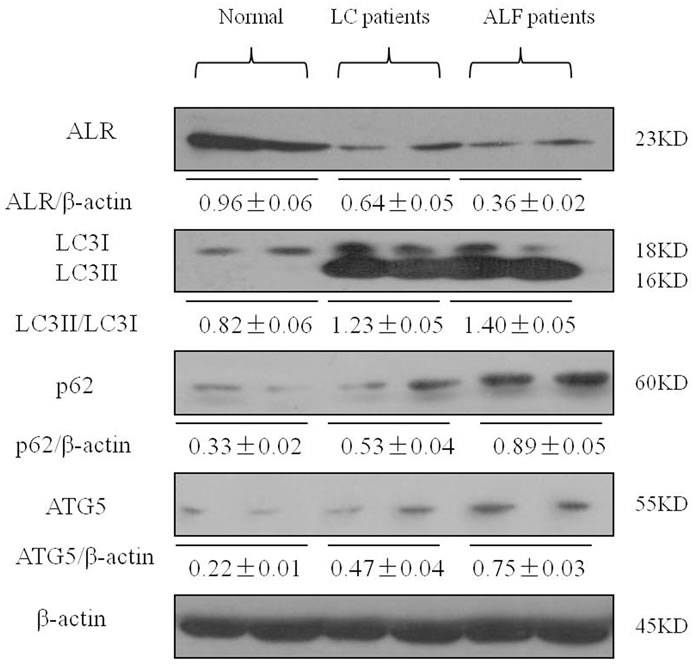 Finally, to determine whether ALR and autophagy participated in the disease process of liver injury, we measured the levels of ALR and autophagy markers in patients with liver cirrhosis (LC) and acute liver failure (ALF). Relative to the normal controls, LC3II conversion and p62 accumulation were significantly increased in patients with LC and ALF. ALR level was decreased in patients with LC and ALF compared to normal controls (Figure 7).