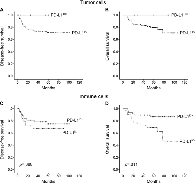 Figure 2: Kaplan-Meier survival curves of disease-free survival and overall survival according to PD-L1 expression in tumor cells (A, B) and immune cells (C, D). No statistics were computed in A and B because all PD-L1TC+ (n = 7) cases were censored.