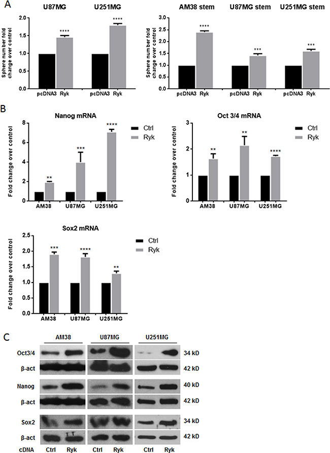 Figure 3: RYK overexpression promotes neurosphere formation. Adherent GBM (U87MG and U251MG) and stem-like derived cells (AM38, U87MG, and U251MG) were transfected with h-RYK cDNA or a control vector. The ability to grow as neurospheres and the expression of stem markers were then analyzed. RYK overexpression increased sphere number in GBM cell lines (A, left panel) as well as in stem-like GBM cells (A, right panel). Data representative of three independent experiments. RYK knockdown also decreased the GSC markers NANOG, OCT3/4, and SOX2 at mRNA and protein levels in all continuous cell lines analyzed (B–C). In (B), mRNA expression was assessed by real-time PCR and normalized against β-actin. Experiments were repeated at least twice. In (C), Western blots are from representative experiments, and β-actin was used as loading control. In (A) and (B), statistical significance calculated using Student’s t-test (p < 0.05 considered significant). Results presented as mean ± SD. **p < 0.01; ***p < 0.001; ****p < 0.0001. In (C) the blots representing Oct3/4 and Nanog for AM38 are from the same gel. Therefore they have the same β-actin normalization.