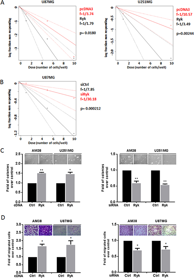 We next performed limiting dilution assay (LDA) in U87MG and U251MG cell lines under sphere-forming condition. Data were analyzed using ELDA (Extreme Limiting Dilution Analysis) software [20]. Cells transfected with h-RYK showed an increased spheroid frequency, demonstrating that RYK expression is able to enrich the stem-like population (Figure 4A). Conversely, RYK knockdown resulted in a reduced stem cells frequency (Figure 4B). Moreover, to explore other cancer-promoting effects of RYK, we investigated whether it had an impact on anchorage-independent cell growth and on cell migration. AM38 and U251MG cells forced to overexpress RYK had an increased capability to form colonies in a semi-solid medium (Figure 4C, left panel); in contrast, RYK knockdown determined a reduction in colony formation (Figure 4C, right panel). Moreover, the migration of AM38 and U87MG cell lines was increased upon overexpression of RYK (Figure 4D, left panel), and lost upon knockdown (Figure 4D, right panel). These results clearly demonstrate that, besides behaving as a stemness promoter, RYK acts as an oncogenic factor, enhancing anchorage-independent cell growth and cell migration in GBM.
