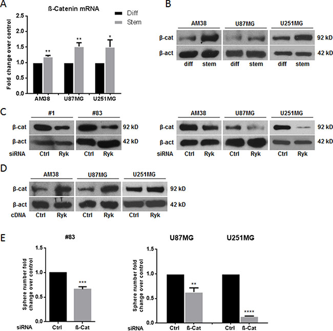Figure 5: RYK’s effects on stem phenotype are mediated by β-catenin. β-catenin mRNA and protein levels were assessed in differentiated and in stem-like GBM cell lines (AM38, U87MG, and U251MG) by real-time PCR (A) and Western blotting (B). Glioblastoma patient-derived stem-like cells (#1 and #83) and differentiated cells (derived from AM38, U87MG, and U251MG cells) were transfected with a RYK siRNA sequence and/or RYK cDNA. RYK knockdown decreased β-catenin in all the cell lines analyzed (C). In contrast, RYK overexpression improved protein level in GBM lines (D). GBM patient-derived stem-like cells (#83) and GBM cell lines (AM38 and U251MG) were transfected with a β-catenin siRNA or a control siRNA and the ability to grow as neurospheres was then analyzed. β-Catenin knockdown reduced sphere number in GSCs from patient #83 and in the two GBM cell lines analyzed (E). Data representative of three independent experiments. In (A), mRNA expression was assessed by real-time PCR and normalized against β-actin. Experiments were repeated at least twice. In (B), (C), and (D), Western blots from representative experiments; β-actin was used as loading control. In (A) and (E), statistical significance calculated using Student’s t-test (p < 0.05 was considered significant). Results presented as mean ± SD. *p < 0.05; **p < 0.01; ***p < 0.001; ****p < 0.0001. In (B) the blot representing β-catenin for AM38 is from the same gel of Figure 1F. In (C) the blot representing β-catenin for patient #83 is from the same gel of Figure 2B. The blot representing β-catenin for AM38 is from the same gel of Figure 2F. In (D) the blots representing β-catenin for AM38 and U87MG are from the same gel of Figure 3C. Therefore they have the same β-actin normalization.