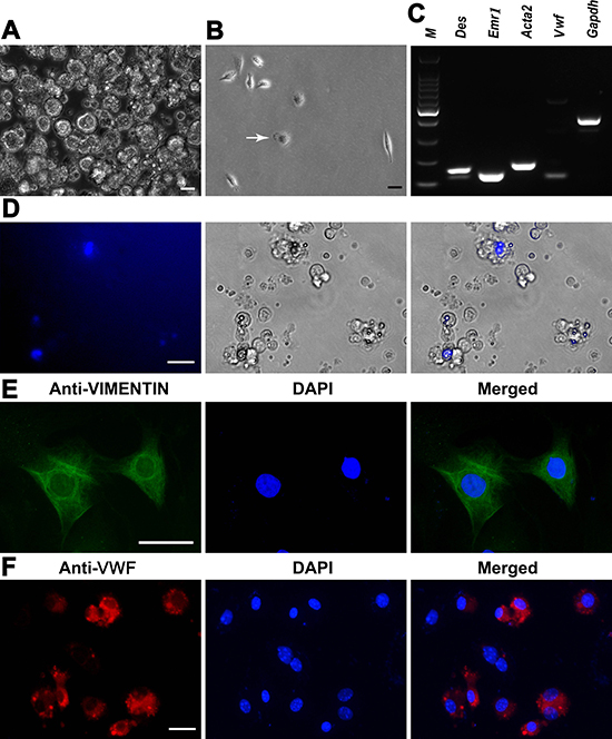 Figure 2: Characterization and identification of mouse liver mesenchymal cells. (A) Mature hepatocytes were removed by percoll density gradient centrifugation. Scale bar = 10 μm. (B) Kupffer cells (white arrow) were isolated by percoll density gradient centrifugation. Scale bar = 10 μm. (C) RT-PCR revealed the expression of Des, Emr1, Acta2, and Vwf in the isolated cells. Gapdh served as a loading control of total RNA. (D) Lipid droplets and retinoid fluorescence were observed in the freshly isolated hepatic stellate cells. Scale bar = 20 μm. (E, F) Immunocytochemistry showed the expression of VIMENTIN in hepatic stellate cells (E) and VWF in liver endothelial cells (F) Scale bar in E = 20 μm; scale bar in F = 10 μm.
